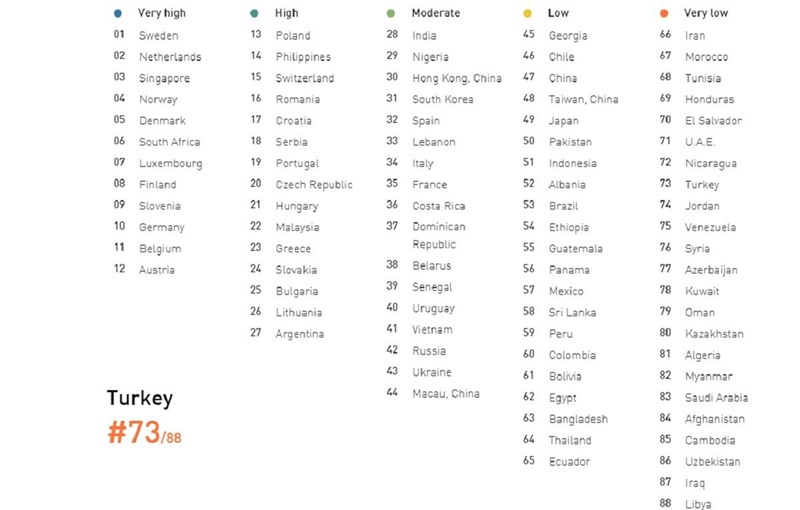 Türkiye’nin geçen yıl bulunduğu sıralama ise 62’ydi. Bu da 11 sıra birden düşüşe karşılık geliyor.