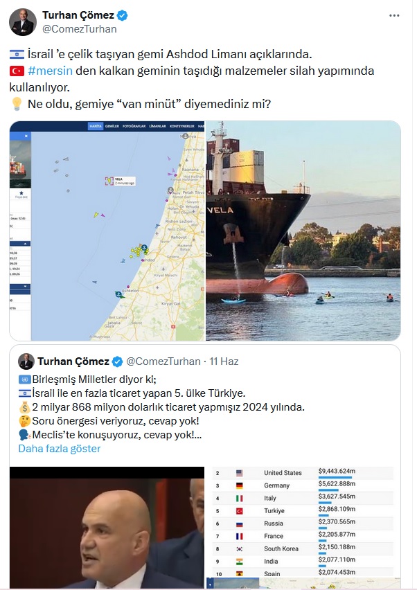 Silah yapımında kullanılan çelik yüklü Vela gemisinin Mersin limanından hareket ederek İsrail’in Ashdod Limanı’na ulaştığını söyleyen Çömez, sosyal medya hesabından yaptığı paylaşımda şu ifadeleri kullandı: