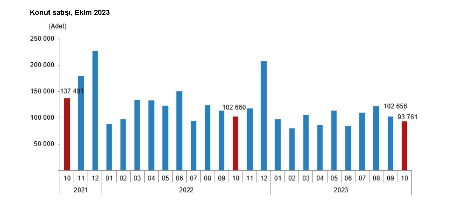 İkinci el konut satışlarındaki son durum da benzer bir tabloyu gözler önüne seriyor. 2023’ün Ekim ayında bu kalemde 2022’nin aynı ayına göre yüzde 8, bir önceki aya nazaran ise yüzde 11’lik bir azalma yaşandı. Ülke çapında ay boyunca toplam 64 bin 531 ikinci el konut satıldı ve ikinci el satışların toplam satışa oranı yüzde 69 olarak gerçekleşti. 2023 Ocak-Ekim dönemi boyunca bir önceki yıla göre kaydedilen azalış satılan 698 bin 31 konut ile yüzde 15 oldu.