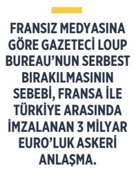 Türkiye’de tutuklu kalan yabancı gazetecilerden Fransız Loup Bureau 51 gün sonra serbest bırakıldı. Fransız medyasına göre Loup’un serbest bırakılmasının sebebi, Fransa ile Türkiye arasında imzalanan 3 Milyar Euro’luk askeri anlaşma. Challenge’s dergisine göre Ankara-Paris hattında yaşanan uzun görüşmelerin ardından Türk hava sahasında yeni teknoloji savunma sistemi kurulacak. Savunma bakanı Fikri Işık’ın Temmuz ayında yaptığı açıklamalar da iddiaları doğrular nitelikte.