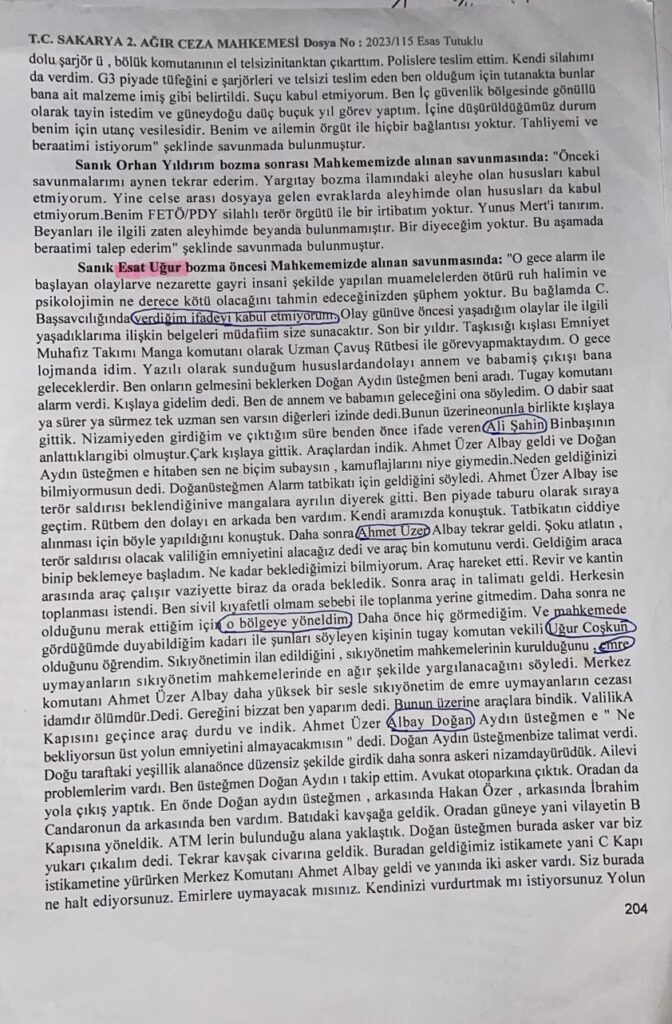 İddianamenizde bulunduğumuz kavşakta cereyan eden olaylar sebebi ile şikayetçi olduğunu iddia eden hiçkimse yoktur. Bahçeye ve bina içine girmedim. Olaylar esnasında silah kullanmadım, svaplar da temiz çıktı. Getiriliş amacımızı söyledik. ‘Fethullahçı örgüt’ ile ilgim yoktur. Albay rütbesi taşıyan sanıklarınız uyandırdıkları izlenim ve bizim tabi olduğumuz kurallardan istifade etmek suretiyle bizi bu işe sürükledi. Şahsen şikayetçiyim. Suçsuzum beraatimi ve tahliyemi istiyorum.”