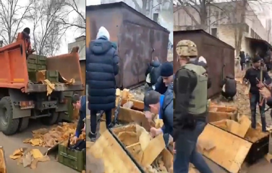 Ukrayna’yı işgal etmek için kara ve hava harekâtını gerçekleştiren Rus birliklerinin başkent Kiev’e girmesinin ardından direnişe katılan binlerce sivile kamyon arkasındaki silahlar dağıtıldı.