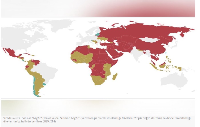 Kurumun sitesinde ayrıca, “Basın Özgürlüğü” başlığı altında, medyanın “özgür” ya da “kısmen özgür” olarak nitelendirildiği ülkelerle, “özgür değil” şeklinde tanımlandığı ülkeler harita halinde veriliyor.