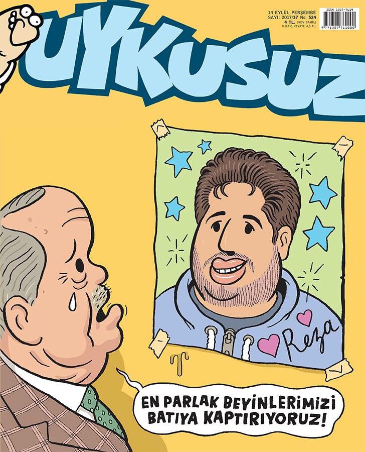 Haftalık mizah dergisinin Uykusuz bu haftaki kapağına AKP Lideri ve Cumhurbaşkanı Tayyip Erdoğan ile ABD’de tutuklu yargılanan Rıza Zarrab’ı taşıdı. Erdoğan’ın geçtiğimiz Pazar günü Kazakistan’ın Başkenti Astana’da gerçekleştirilen İslam İşbirliği Teşkilatı (İİT) 1. Bilim ve Teknoloji Zirvesi’nin açılış oturumunda yaptığı, “En parlak beyinlerimizi batıya kaptırıyoruz” açıklamasından yola çıkan dergi, kapağında Rıza Zarrab üzerinden bu diyaloğu verdi.