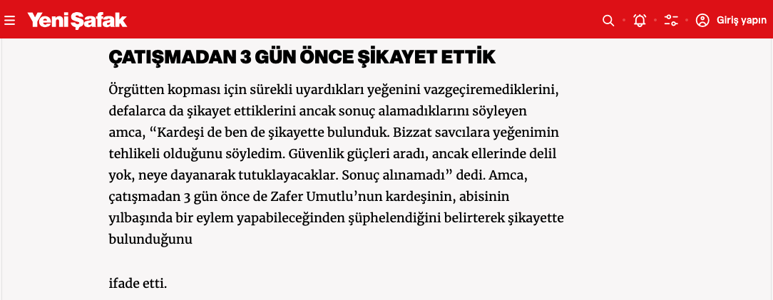Örgütten kopması için sürekli uyardıkları yeğenini vazgeçiremediklerini, defalarca da şikayet ettiklerini ancak sonuç alamadıklarını söyleyen amca, “Kardeşi de ben de şikayette bulunduk. Bizzat savcılara yeğenimin tehlikeli olduğunu söyledim. Güvenlik güçleri aradı, ancak ellerinde delil yok, neye dayanarak tutuklayacaklar. Sonuç alınamadı.” dedi. Metin Umutlu, çatışmadan 3 gün önce de Zafer Umutlu’nun kardeşinin, abisinin yılbaşında bir eylem yapabileceğinden şüphelendiğini belirterek şikayette bulunduğunu ifade etti.