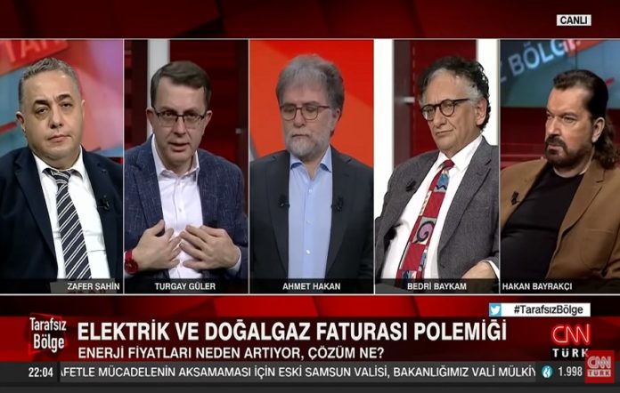 Elektrik ve doğalgaz zamları ve yüksek faturalar, AKP’ye yakınlığıyla bilinen CNNTürk’te Ahmet Hakan’ın sunduğu ‘Tarafsız Bölge’ programında tartışıldı. Programa Turgay Güler, Hakan Bayrakçı, Bedri Baykam ve Zafer Şahin katıldı.