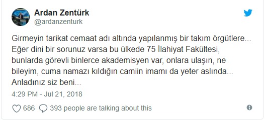 Hesabından, “Girmeyin tarikat cemaat adı altında yapılanmış bir takım örgütlere…” diyen Zentürk, “Eğer dini bir sorunuz varsa bu ülkede 75 İlahiyat Fakültesi, bunlarda görevli binlerce akademisyen var, onlara ulaşın, ne bileyim, cuma namazı kıldığın camiin imamı da yeter aslında…” diyerek devam etti. Zentürk en sonunda ise “Anladınız siz beni…” diyerek mesajını tamamladı.