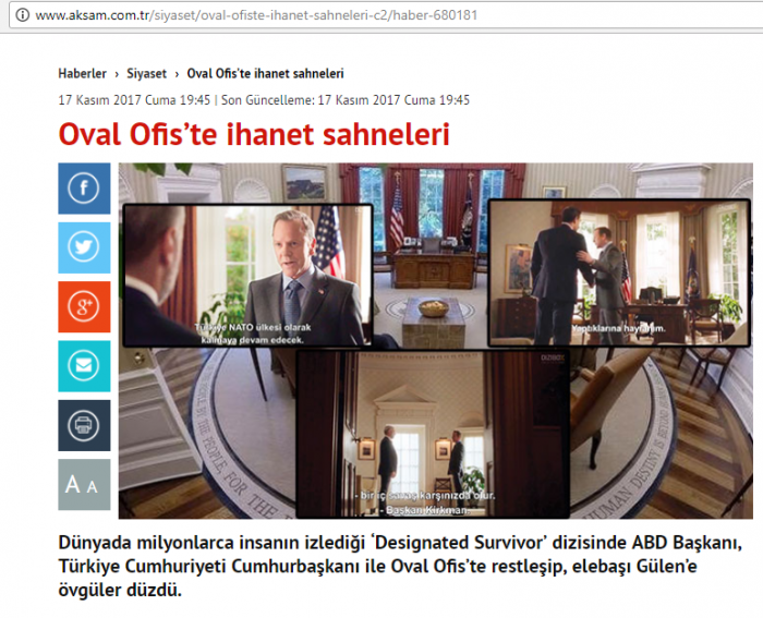 Akşam gazetesinin internet sitesine yansıyan haberde aynen şu cümlelerle dizi haberleştirildi: “ABD menşei dijital yayın platformu Netflix’in yayıncısı olduğu ve dünyada milyonlarca insanın izlediği ‘Designated Survivor’ dizisi büyük bir skandala imza attı! Dizide ABD Başkanı, Oval Ofis’te Türkiye Cumhuriyeti Cumhurbaşkanı’nı karakterize eden “Fatih Turan” isimli şahsı NATO üslerinin ABD tarafından kullanılacağını söyleyerek tehdit etti. Türkiye Cumhuriyeti Cumhurbaşkanı, Gülen’i temsil eden “Nuri Şahin”in Türkiye’ye iadesini aksi taktirde Türkiye’nin NATO’dan çıkacağı, ABD ile müttefiklik ilişkisinin bitirileceği ve NATO üstlerinin ABD için kapatılarak Rusya’ya verileceğini söyledi. ABD Başkanı “Ülkende iç karışıklık çıkarırım” diyerek tehdit etti. ABD Başkanı, Gülen’i Oval Ofis’e çağırdı, koluna girerek “Yaptıklarına hayranım ve burada güvendesin. Bir gün ülkene döneceğine inanıyorum” dedi.”