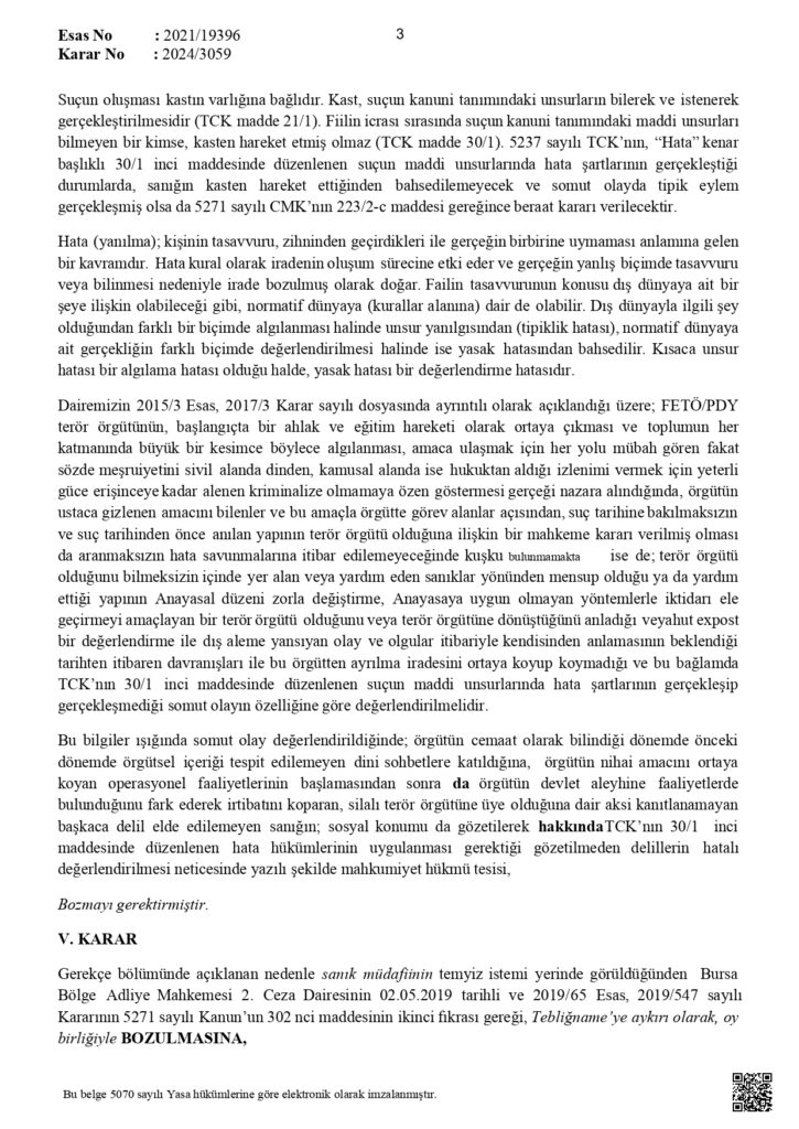 Dosyayı inceleyen Yargıtay 3. Ceza Dairesi, Türk Ceza Kanunu’nun 30. Maddesi’ndeki ‘fiilin icrası sırasında suçun kanuni tanımındaki maddi unsurları bilmeyen bir kimse, kasten hareket etmiş olmaz. Bu hata dolayısıyla taksirli sorumluluk hali saklıdır.’’ gereğince sanığın beraatına hükmedilmesi gerektiğine dikkat çekerek kararı bozdu.