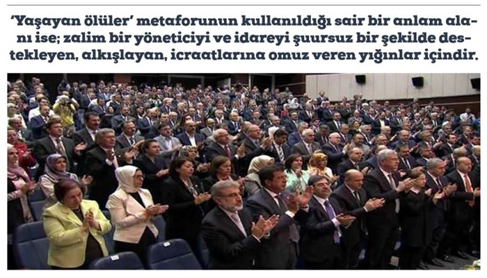 ‘Yaşayan ölüler’ metaforunun kullanıldığı sair bir anlam alanı ise; zalim bir yöneticiyi ve idareyi şuursuz bir şekilde destekleyen, alkışlayan, icraatlarına omuz veren yığınlar içindir. İlginçtir, günümüz Türkiye’sinde ise ‘yaşayan ölüler’ metaforunun kullanıldığı mana katmanlarının neredeyse tümüne rastlamak mümkün.