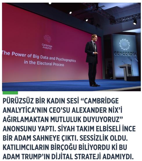 Creedence Clearwater Revival’ın “Bad Moon Rising”in gitar riffleri New York’un Grand Hyatt otelinin koyu mavi salonunu doldurmuştu. Concordia Summit, Dünya Ekonomi Forumu’nun bir çeşit minyatürüydü. Tüm dünyadan aralarında İsviçre Konfederasyon Başkanı Johann Schneider-Ammann’ın da olduğu karar-alıcılar çağrıldı. Pürüzsüz bir kadın sesi “Cambridge Analytica’nın CEO’su Alexander Nix’i ağırlamaktan mutluluk duyuyoruz” anonsunu yaptı. Siyah takım elbiseli ince bir adam sahneye çıktı. Sessizlik oldu. Katılımcıların birçoğu biliyordu ki bu adam Trump’ın dijital strateji adamıydı. Sunum önce Youtube’da yayınlandı ama daha sonra buna ulaşmak zorlaştı. Şimdi ise sadece belli bölümlerini izlemek mümkün.