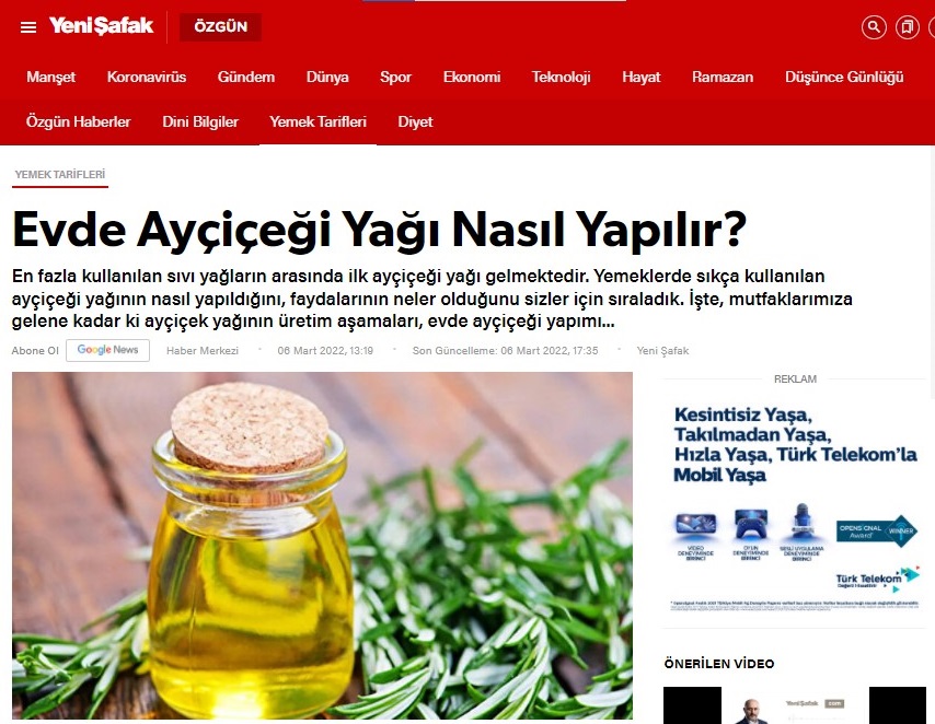 Yenişafak’ın internet sitesinde yer alan “Evde Ayçiçeği Yağı Nasıl Yapılır?” başlıklı haberi, Yeni Akit de sayfalarına taşıdı. Haberde vatandaşların evde nasıl ayçiçek yağı yapacakları anlatılıyor.