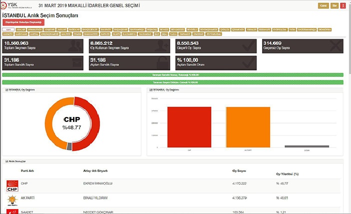 Sayılan sandık oranı yüzde 98.6. Ekrem İmamoğlu’nun oyu: 4 milyon 170 bin 222Binali Yıldırım’ın oyu ise: 4 milyon 156 bin 279.Aradaki oy farkı: 13 bin 943.