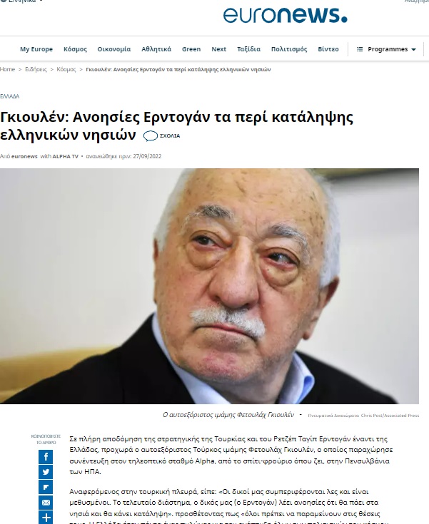 Newsbomb.gr ise “Gülen, Türk-Yunan İlişkilerinde Tarafını Belirliyor: Bizimkiler sarhoş gibi davranıyor” başlıklı haberinde, Alpha kanalının videosunu yayınladı. Gülen’in son aylarda dozu artan adalara ilişkin tehditleri eleştirdiği yorumu yapıldı.