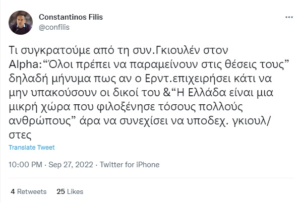 Twitter hesabından paylaşımda bulunan tanınmış analist Filis, Alpha Tv’nin Gülen röportajından çıkarılması gerekenler ve ima ettiklerine dair şunları yazdı: “Gülen: Herkes yerinde kalmalı.” dedi. Erdoğan eğer bir girişimde/harekette bulunur ise adamları ona eşlik edip dinlemesin (imasında bulundu). Yine (Gülen), “Yunanistan küçük bir ülke olmasına rağmen çok fazla insanı ağırladı.” Yunanistan, Gülenistleri kabul etmeyi sürdürmelidir (imasında bulundu).”