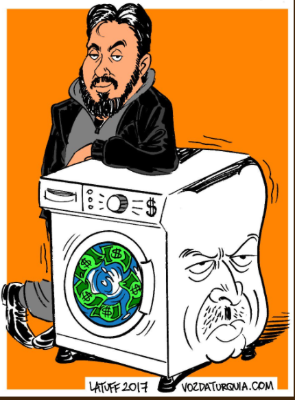 Zarrab davasını çizen Latuff, karikatürünü Türkçe mesajla paylaştı: ‘Zarrab-Erdoğan A.Ş. – Yıkamada bir numara’