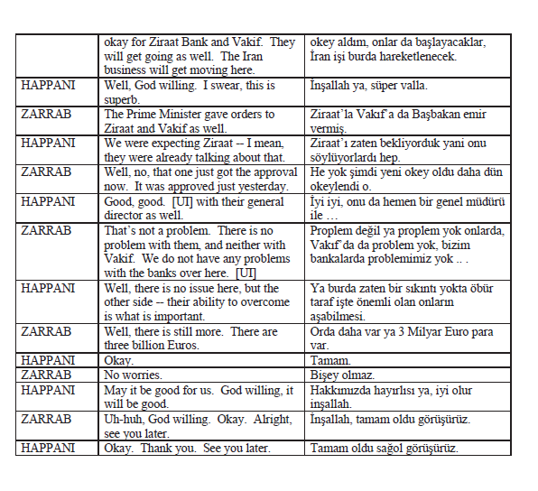 FBI’ın mahkemeye sunduğu deliller arasında yer aldığı tahmin edilen bu tapelerde Zarrab, yakın adamı Abdullah Happani’ye, Ankara’ya yaptığı ziyareti anlatıyor. Happani’nin Zarrab’a Ankara’ya gitme sebebini sorduğu soruya Zarrab, “He he, Ziraat Bankası ile Vakıf’a da okey aldım, onlar da başlayacaklar. İran işi burda hareketlenecek.” diyor.Happani’nin “İnşallah ya, süper valla” sözlerinin ardından Zarrab, “Ziraat’la Vakıf’a da Başbakan emir vermiş.” cevabını veriyor. Zarrab, 3 milyar Euro paranın beklediğini anlatıyor.